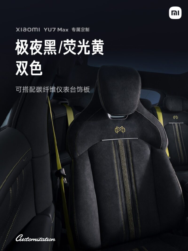 Customization extends beyond paintwork. Buyers can select wheel designs, Brembo brake calliper colours, and bespoke badges. Options include black 24K gold, white ceramic, and carbon-fibre finishes. For the YU7 Max, interior customization is available with two new Alcantara-based colour schemes: Blue-Black and Black with Fluorescent Yellow, accompanied by custom stitching, colour-matched seatbelts, and real ash wood trim.