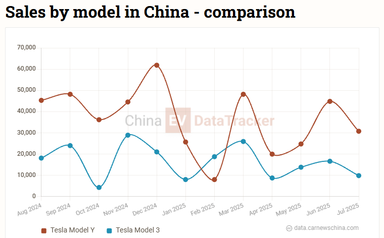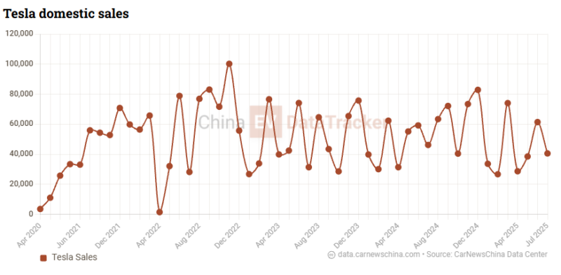In July, Tesla sold 40,617 cars in China, down 33.9% from June and 12% year-over-year. In the first seven months of 2025, Tesla sold 304,027 vehicles in China, down 6.3% from the same period last year.