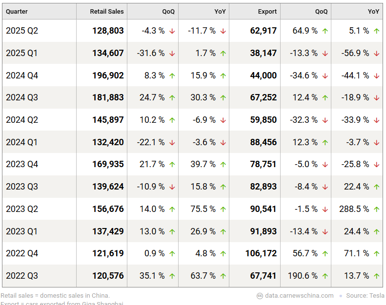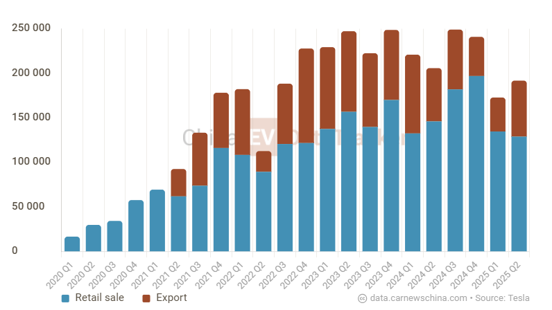 In Q2, domestic sales accounted for 67.2% of Tesla China sales, and exports accounted for 32.8%. That shows exports slightly grew their share of Tesla China sales, as in Q2 2025, it accounted for only 29.1%.
