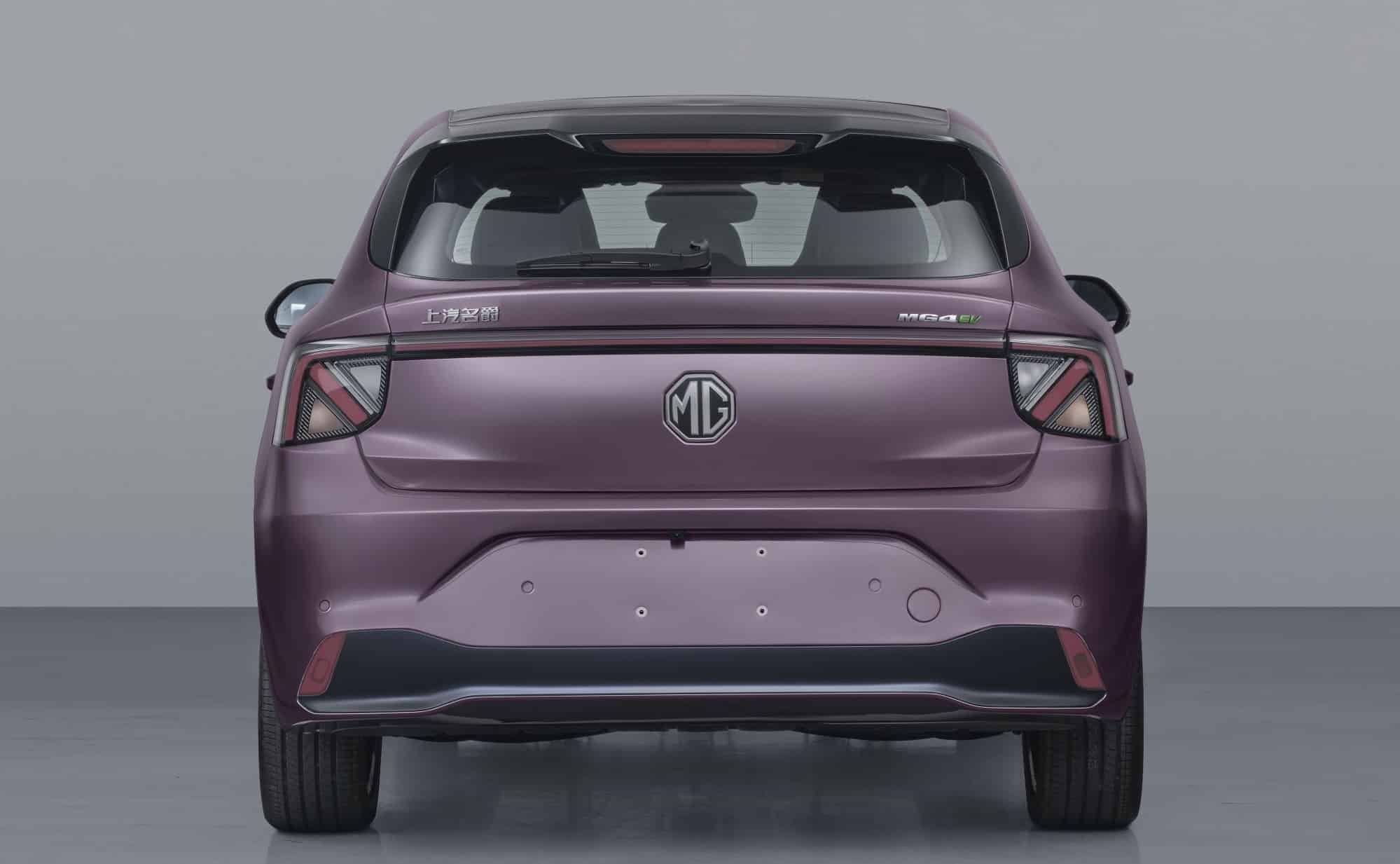 The MG4 EV in official images is finished in a light purple color. It adopts white-colored pillars and a roofline. The front end of the MG4 EV integrates LED headlights and a sporty bumper with a trapeze-shaped air intake. Sculpted fenders visually expand the MG4 EV. The charging port sits in the left front fender of the car.