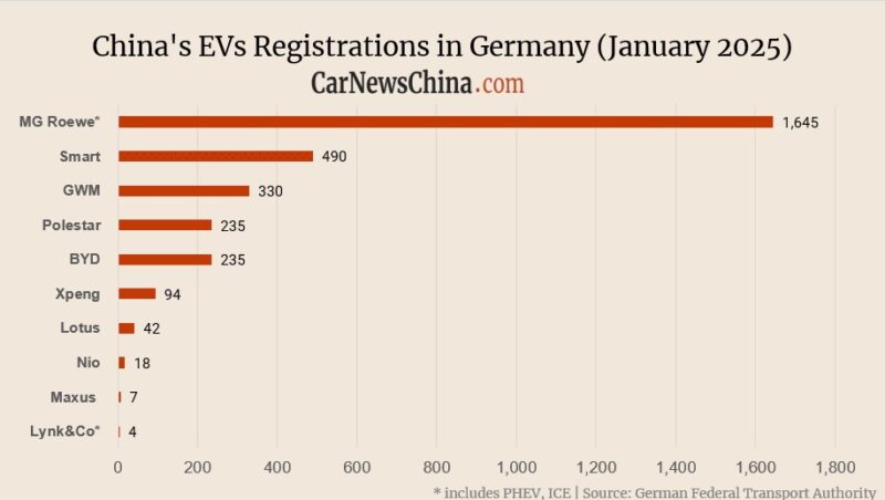 SAIC-owned MG got the first spot with 1,645 registered vehicles, down 11.3% from 1,854 units in December and up 84% from 896 vehicles in the same month last year. In 2024, MG sold 20,977 vehicles in Germany.
