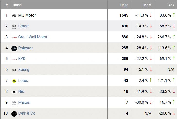 For comparison, Tesla registered 1,277 vehicles, down 59.5% from the same month last year.