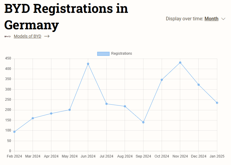 BYD registered 235 vehicles, down 27.2% from 323 units in December and up 69% from 139 vehicles in the same month last year. In 2024, BYD sold 2,891 vehicles in Germany.