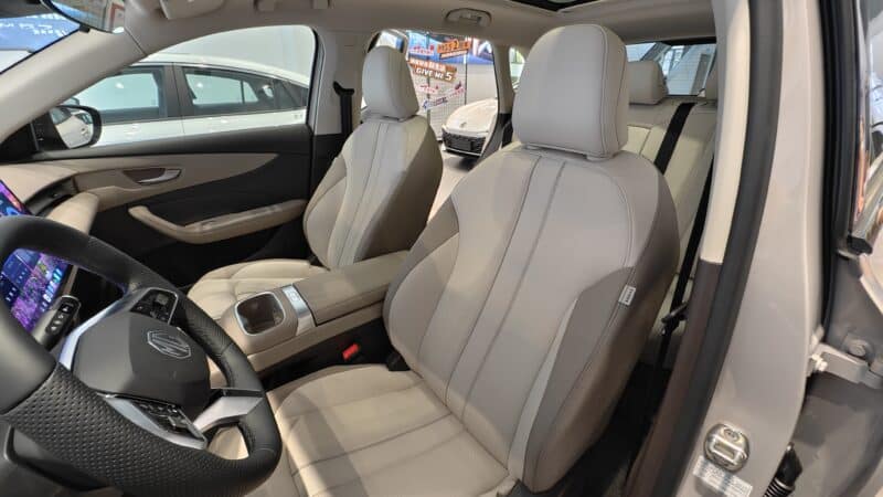 Steering feedback is precise yet light, suitable for novice and experienced drivers. The ES5 sharpens its cornering capabilities in Sport mode. The RWD configuration allows smooth transitions through corners, aided by the XDS cornering dynamic control system. This feature applies light braking to the inner wheels, enhancing agility and minimizing understeer. The vehicle’s steering precision impressed during slalom exercises, delivering consistent feedback and confidence. The MG ES5 feels more connected and engaging than its front-wheel-drive competitors, like the BYD Yuan Plus.