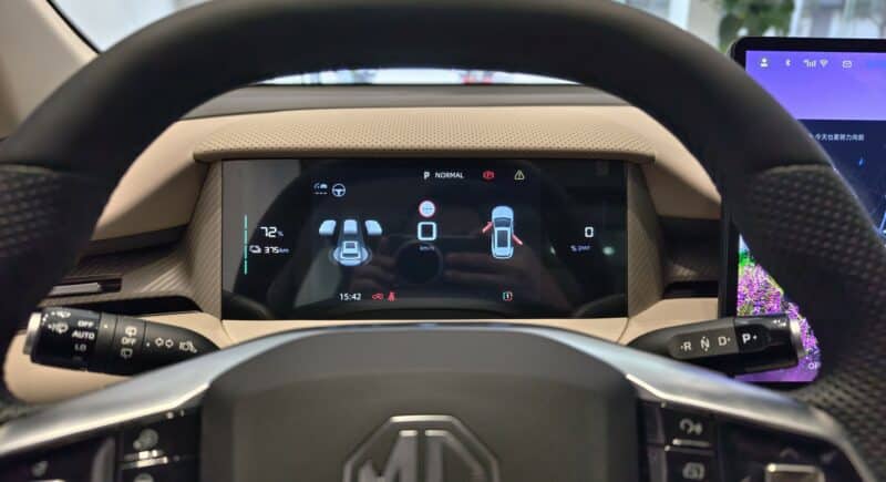 The MG ES5 embraces a minimalistic design approach. The cabin’s centerpiece is a 15.6-inch floating touchscreen for infotainment powered by a Horizon J3 chipset, paired with a 10.25-inch LCD instrument cluster. The steering wheel features a three-spoke D-shaped design, with the gear shifter mounted conveniently behind it. The center console offers practical touches, including a wireless charging pad and two cup holders.
