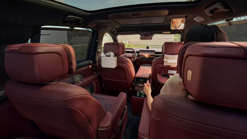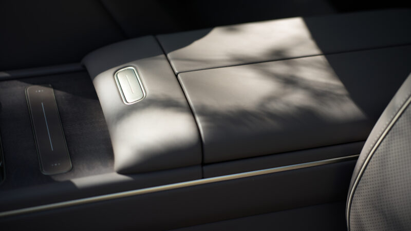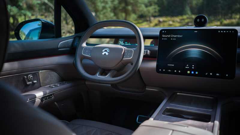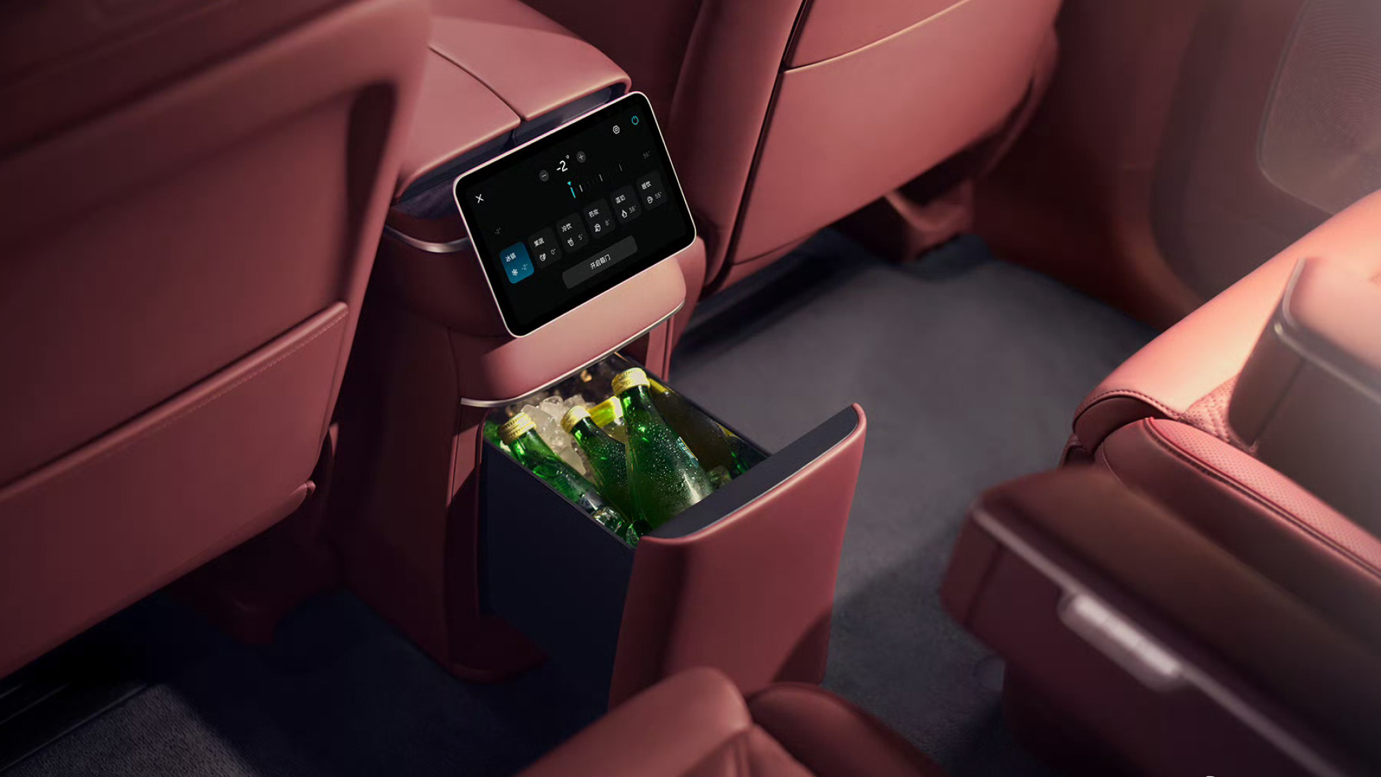 Nio also shared official images of the ES8’s interior. Core highlights are sunshades, a sunglasses holder in the center console, seat adjustment buttons on the door cards, two wireless phone charging pads, a built-in refrigerator, and a ceiling-mounted screen.