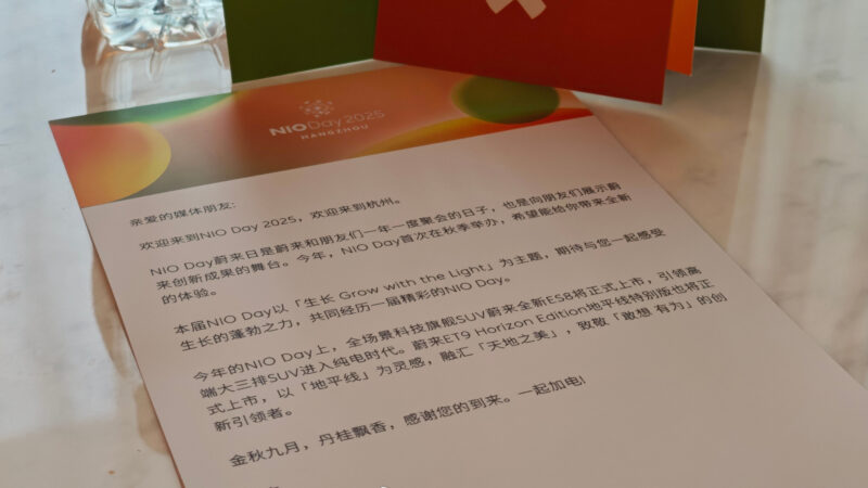 12:00 (GMT+8): Nio welcomed Chinese and overseas media with a letter, highlighting that it is the first time Nio Day comes in autumn. This year’s theme is “Glow with the Light.” Today, Nio plans to present two models: the all-new ES8 crossover and the ET9 Horizon Edition sedan.