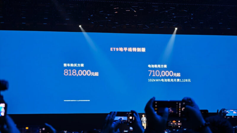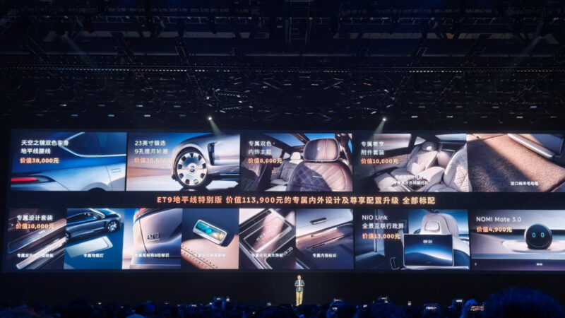 19:40 (GMT+8): The Nio ET9 Horizon Edition enters the Chinese market for 818,000 yuan (115,000 USD). The BaaS (Battery as a Service) purchase plan allows for a reduction in price to 710,000 yuan (99,810 USD). The Nio ET9 adopts a two-color body. Nio calls it “Horizon Beltline.” It has a zero-order difference paint surface that was polished for 15 hours. Other highlights include 23-inch rims, the Nomi Mate 3.0, four comfy seats (front-row seats are black and rear-row seats are white), and more.