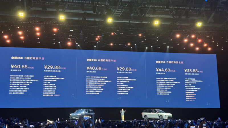 21:00 (GMT+8): The Nio ES8 III launched in China with a price between 406,800 and 446,800 yuan (57,190 – 62,810 USD), with BaaS price ranging from 298,800 to 338,800 yuan (42,000 – 47,630 USD). It is the first China-made smart NEV crossover with three generations. Deliveries of the Nio ES8 will start on September 21. Trims and prices are as follows: