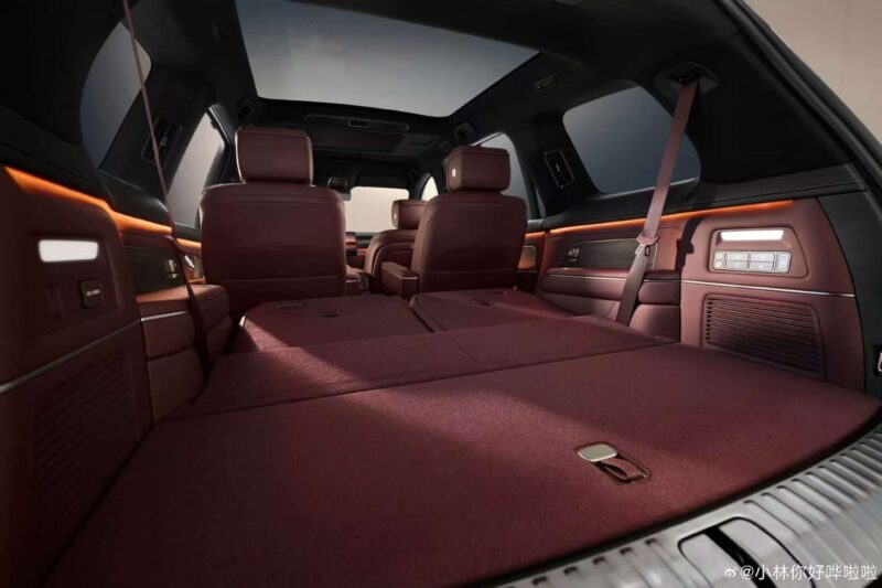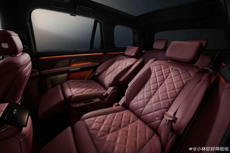The six-seat version features second-row seats that recline up to 151 degrees and support leg extension heating. All rows include seat heating, while selected seats offer ventilation. Additional interior features include five-zone climate control, folding tables, a refrigerator, a 27-speaker, 2,600-watt Dolby Atmos audio system, and a 21.4-inch rear ceiling-mounted display with 3K resolution.