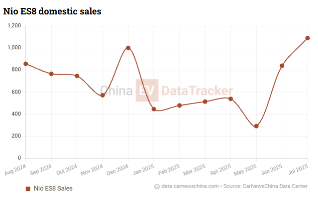 With its larger size and updated specifications, the ES8 competes with large electric SUVs such as the Aito M8 (from 378,000 yuan, approx. 52,740 USD) and the Aito M9 (from 509,800 yuan, approx. 71,120 USD). According to China EV DataTracker’s sales data, the previous ES8 generation sold 1,090 units in July 2025.