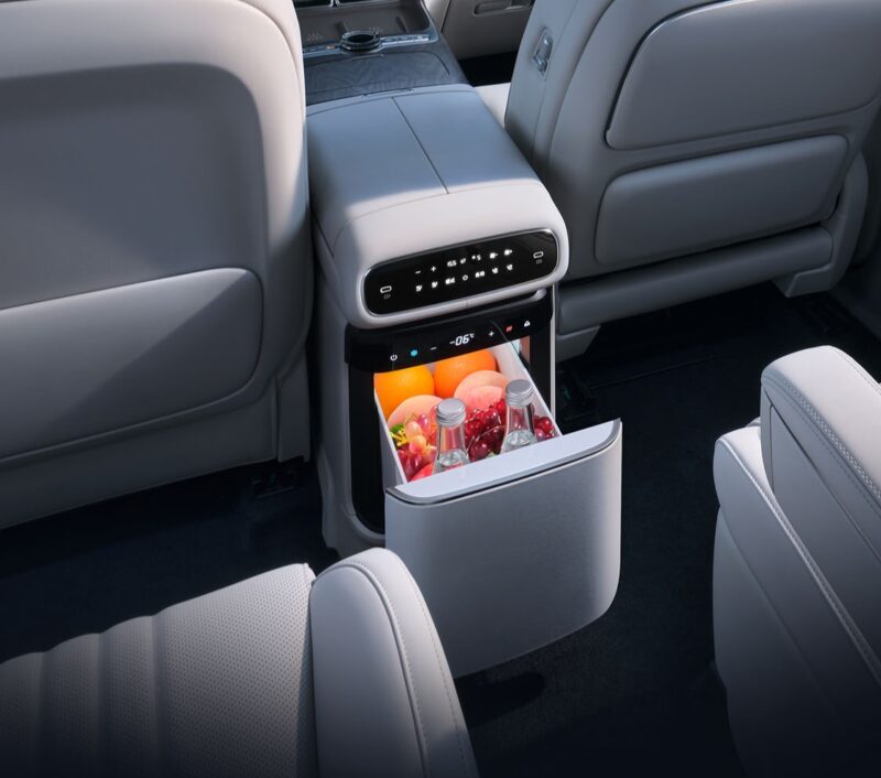 The 9.1L refrigerator embedded under the center console with a temperature range of -6°C to 50°C is available on the high-end trims.
