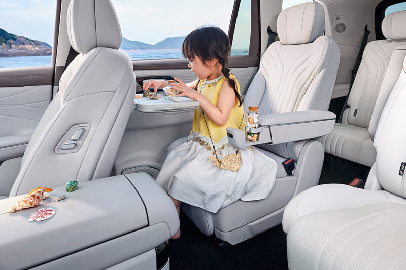 The interior area reaches 5.2 m2. The 2+2+2 six-seat layout has a double independent seat in the second row. The seats are equipped with leg rests and lumbar support, ventilation, heating, and 10-point massage functions.