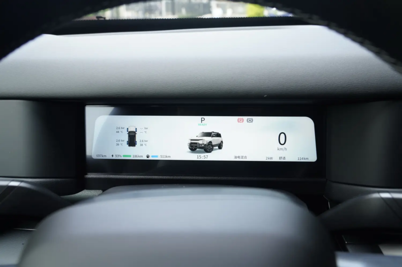 Inside, the vehicle adopts a design infused with rugged styling elements. Smart features include an embedded full LCD instrument panel and a floating 15.6-inch central control screen powered by a Qualcomm Snapdragon 8155 chip.