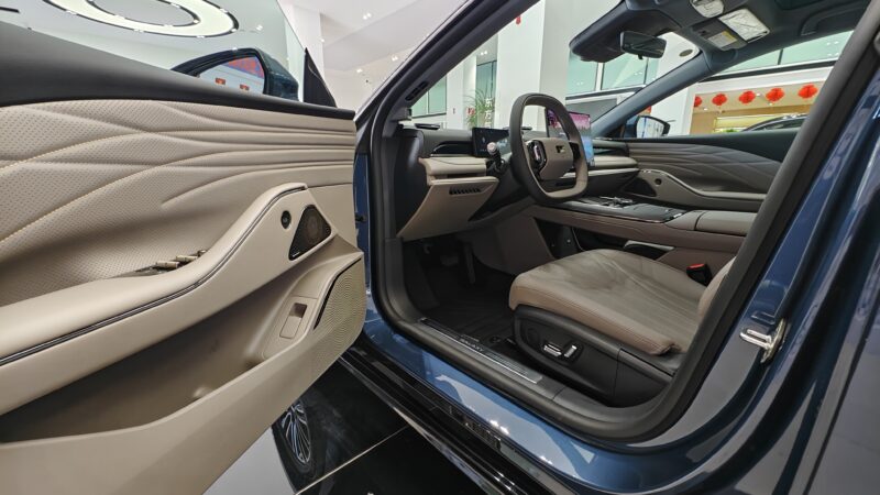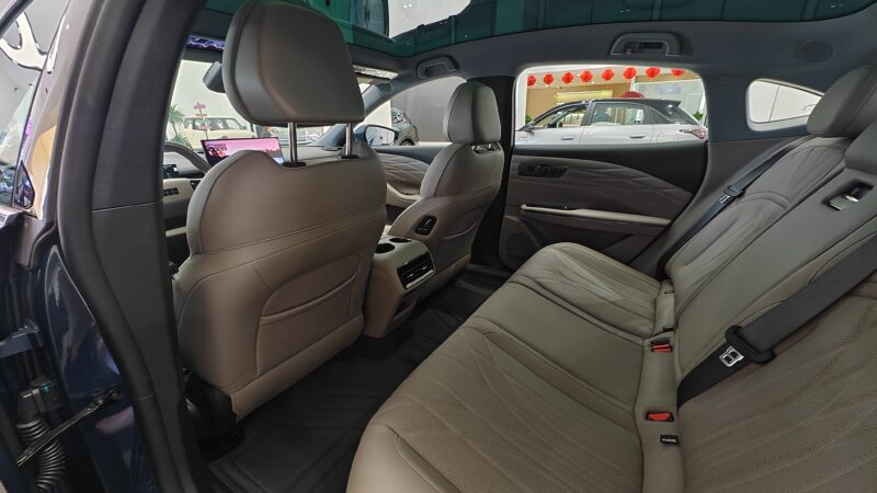The nearly 3-meter wheelbase allows generous second-row legroom, though the sloping roofline slightly reduces headroom. A panoramic 1.36 m² sunroof is available on higher trims, complemented by 256-colour ambient lighting. Practicality is further enhanced with 405 L of trunk space, capable of accommodating five 20-inch suitcases, and 30 interior storage spaces. Seats offer ventilation, heating, and massage functions on select trims.