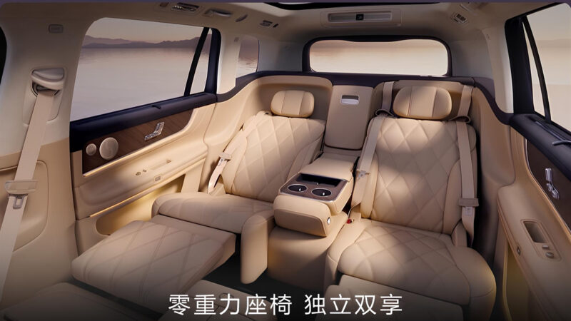 The Aito M9 with four seats inside has two captain chairs in the second row. Both seats support independent zero-gravity mode and a power-operated leg rest. Other functions include heating, ventilation, and massage. There is a large armrest between two seats with two cup holders and a hidden compartment. This trim level of the Aito M9 aims at the high-end chauffeur-driven car segment.