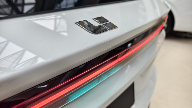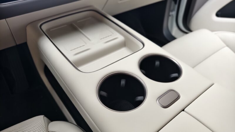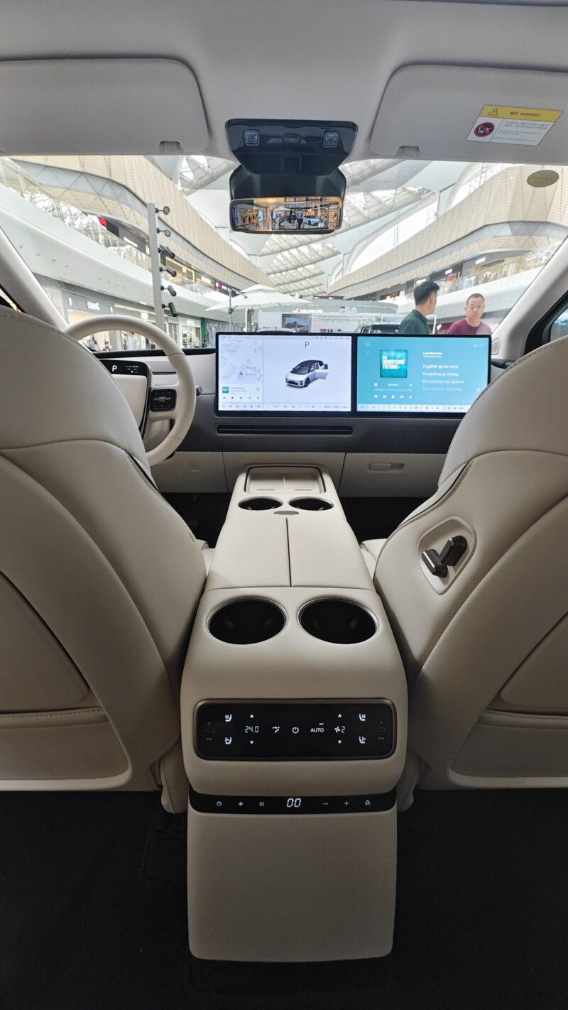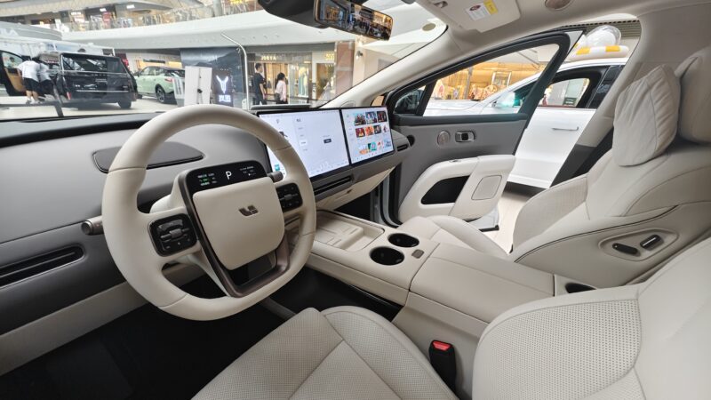 The i8’s cabin keeps Li Auto’s familiar dual-screen front layout, now joined by a small steering wheel display and a large HUD. The lower seating position and distant windshield create a more car-like cockpit, with sportier seats featuring higher bolsters. Ambient lighting adds full-length LED strips, and multiple colour themes, including brighter tones, are offered to target younger buyers.