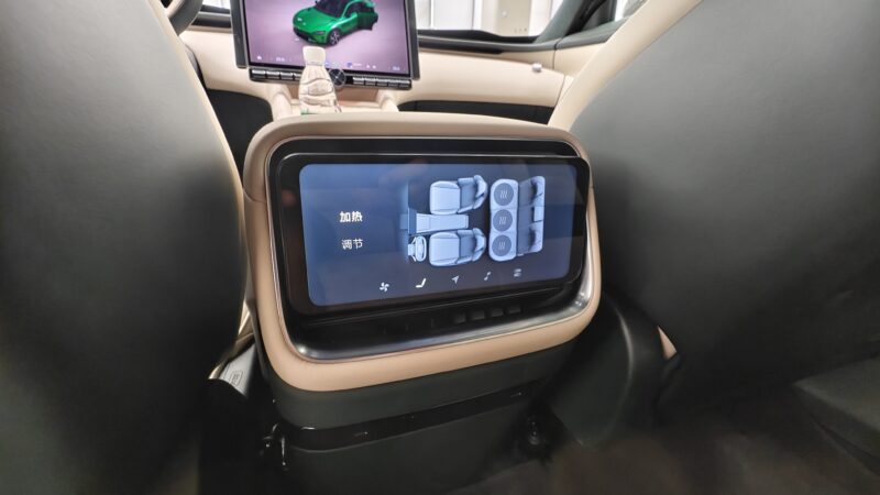 Rear passenger space is generous. With a nearly flat floor and reclining rear seats, the YU7 can comfortably accommodate adults over long distances. The Max trim includes a detachable rear entertainment screen and a fold-down table tray.