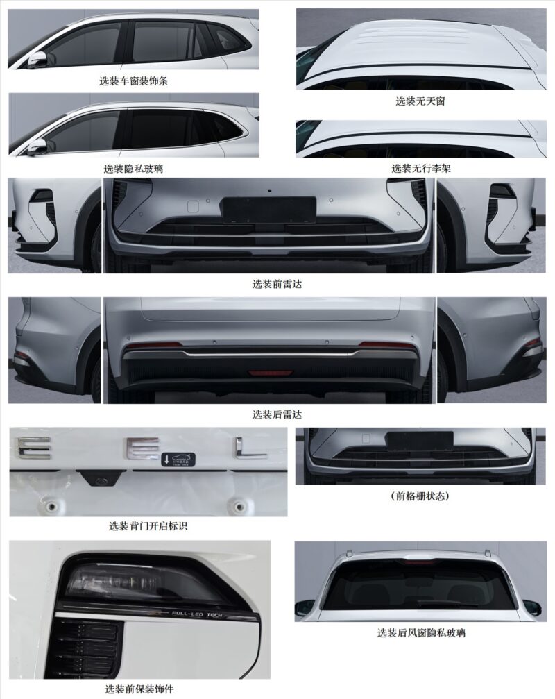 Other optional configurations include window trim, privacy glass, sunroof, luggage rack, front and rear radars, tailgate opening indicator, and front fender garnish.