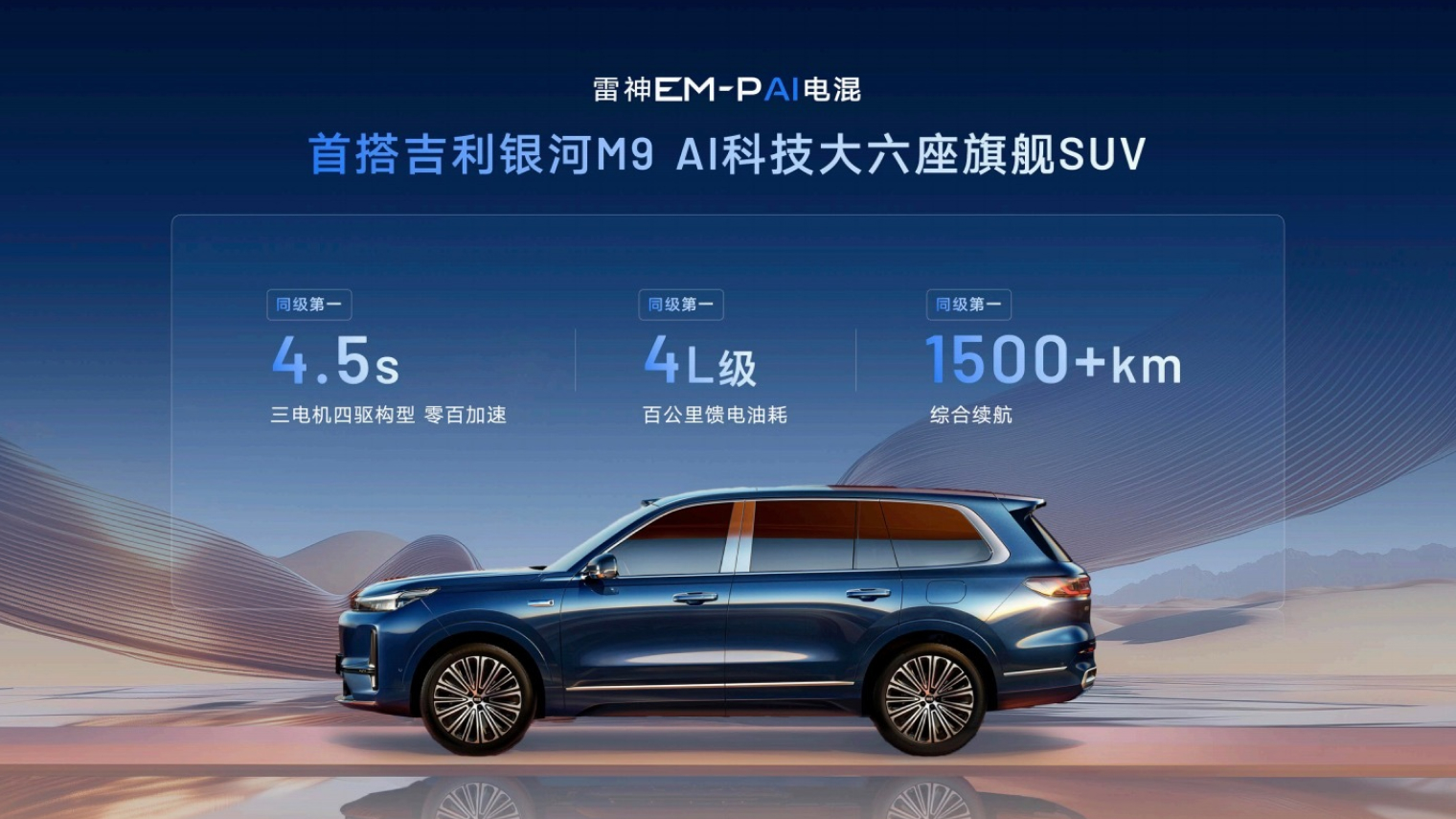 The Leishen AI Hybrid 2.0 EM-P system will offer a turbocharged ICE and all-wheel drive system. The Geely Galaxy M9 full-size SUV will become the first car to adopt it. Geely claims that artificial intelligence will improve dynamic torque distribution. The Galaxy M9 has a mixed cruising range of 1,500 km, a fuel consumption of 4.8 liters per 100 km, and a zero-to-hundred acceleration time of 4.5 seconds. This model will also launch in China in the second half of 2025.
