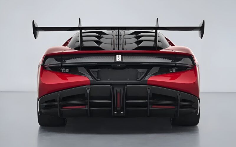The U9 Track Edition largely retains the exterior design of the existing model, shown in red paint with a gloss black styling package. Standard equipment includes 20-inch wheels with 325/35 R20 tyres, a carbon-fibre roof, a large fixed carbon-fibre rear wing, and a rear diffuser fitted with adjustable blades for aerodynamic optimisation. Filing documents list optional aerodynamic parts, such as a standard or enhanced carbon-fibre front splitter and an electric rear wing.