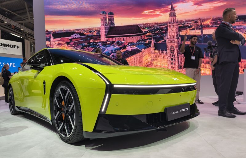 But my destination lies elsewhere. Right next to Volkswagen’s fort, a smaller booth has attracted a significant crowd. People gather around a strikingly green, futuristic-looking sedan. It is updated P7, which had its global debut here just a few hours ago as The New P7.