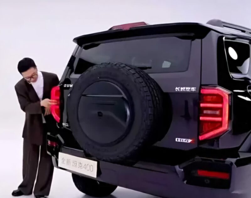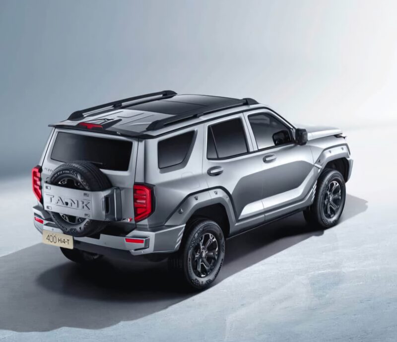 In the rear, an external spare tire continues to be present, but the guard has been removed. The tail badge positioning has been adjusted, with the “GWM TANK” and “Great Wall Motors” logos at the top and the “Tank 400” and “Hi4-T / Hi4-Z” logos at the bottom.