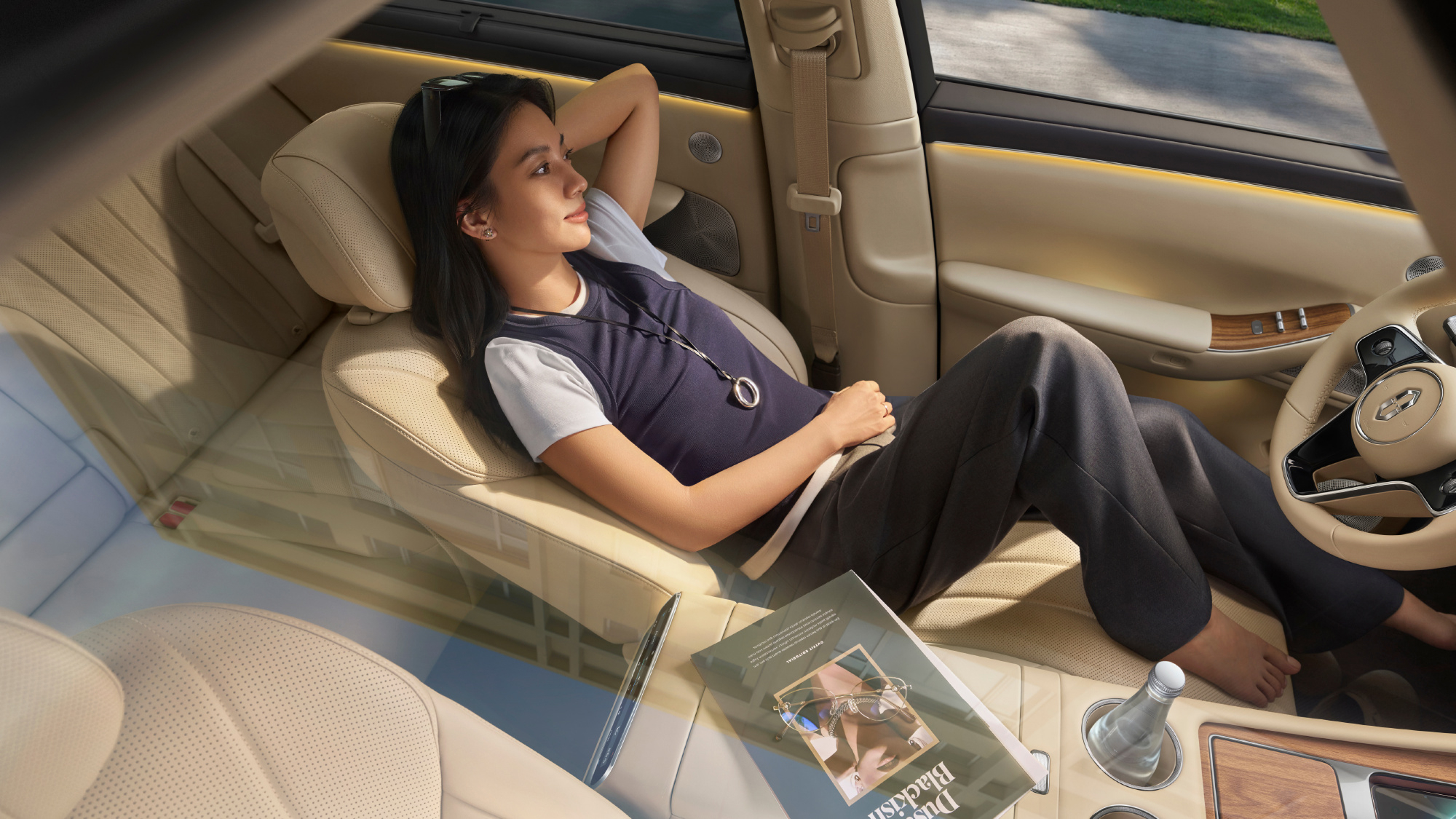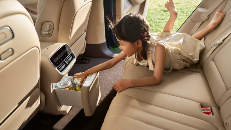 A five-seat variant of the Aito M7 was shown in an official image. The rear passengers of the car adopt folding tables, a refrigerator, and a ceiling-mounted folding screen. It is worth mentioning that other Aito models adopt a projector instead of the screen.