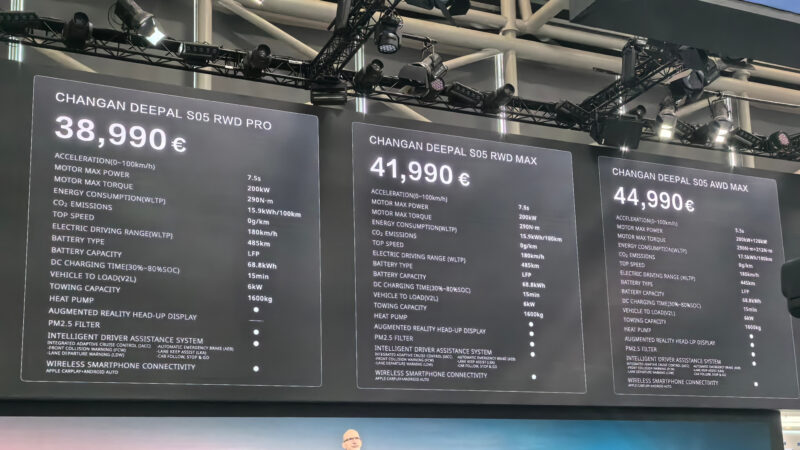 The Deepal S05 BEV for Europe adopts an LFP battery for 68.8 kWh. The entry-level S05 has a single e-motor in the rear axle for 200 kW (268 hp) and 290 Nm. It speeds up to 100 km/h in 7.5 seconds. The towing capacity of this EV reaches 1,600 kg. The RWD variant of the Deepal S05 can run up to 485 km under WLTP conditions. The 4WD variant of the S05 offers a peak output of 320 kW (429 hp) and 502 Nm. Its zero-to-hundred acceleration time is 5.5 seconds.