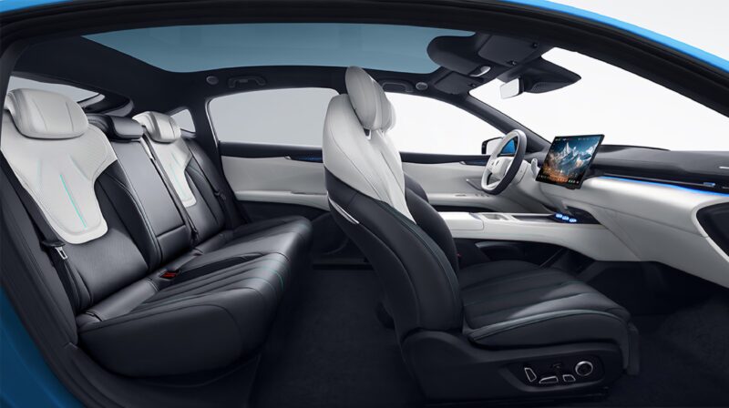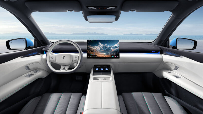 The cockpit is equipped with a 55-inch AR-HUD, a 15.6-inch 2.5K central control screen, and a redesigned three-spoke flat-bottom steering wheel. The central control screen can also rotate by 15 degrees, depending on the trims. Additionally, the cockpit chip is upgraded to the Qualcomm Snapdragon 8295P from the previous 8155 chip to power the Deepal OS 4.0, which comes with a built-in AI assistant.