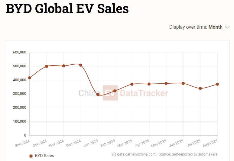 In July, BYD sold 341,030 passenger vehicles globally, up only 0.1% from last year. In August, the company sold 371,501 cars, up only 0.2% from last year. This is the lowest year-over-year growth since January 2021, when China EV Datatracker monitored BYD sales.